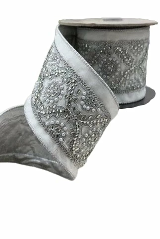 This luxurious pearl trimmed ribbon is a showstopper. It features a white velvet base encrusted with jewels and pearls to make an everlastine impression. It measures 4″ in width, and having wired edges makes it easy to manipulate. Use this on any Christmas tree, Garland, or as a bow for gifts.