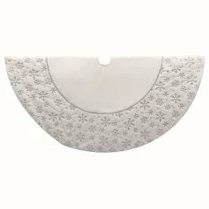 This 54-Inch White and Silver Velvet Sequin Snowflake Treeskirt is a fun and festive addition to any holiday dΓ©cor. This white velvet tree skirt features silver sequined snowflakes, a faux fur border and a metallic cord trim. This is a perfect way to decorate your Christmas tree!